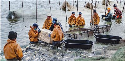 北塘寧車沽萬(wàn)畝魚塘出魚 圖片由北塘街道提供