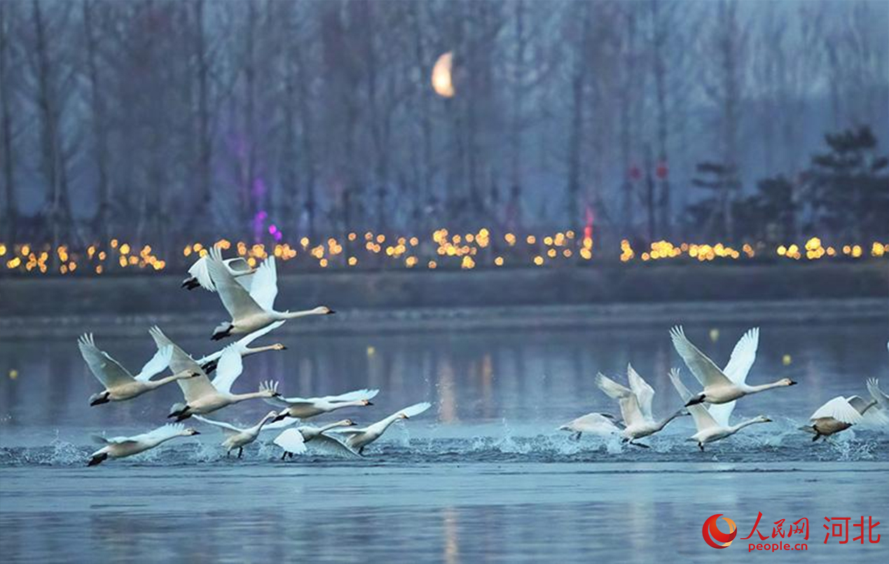 河北省石家莊市滹沱河葉子廣場(chǎng)東側(cè)的水面上,數(shù)百只白色的精靈小天鵝在這里嬉戲。 劉洵攝
