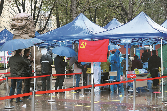 南京市發(fā)布關(guān)于疫情防控措施動態(tài)升級調(diào)整的通告(第11號),自21日起,南京市在全市開展新一輪分區(qū)域規(guī)模性核酸檢測。圖為鼓樓區(qū)下關(guān)街道閱江樓核酸檢測點,市民在接受核酸采樣。 本報記者 陳儼 攝