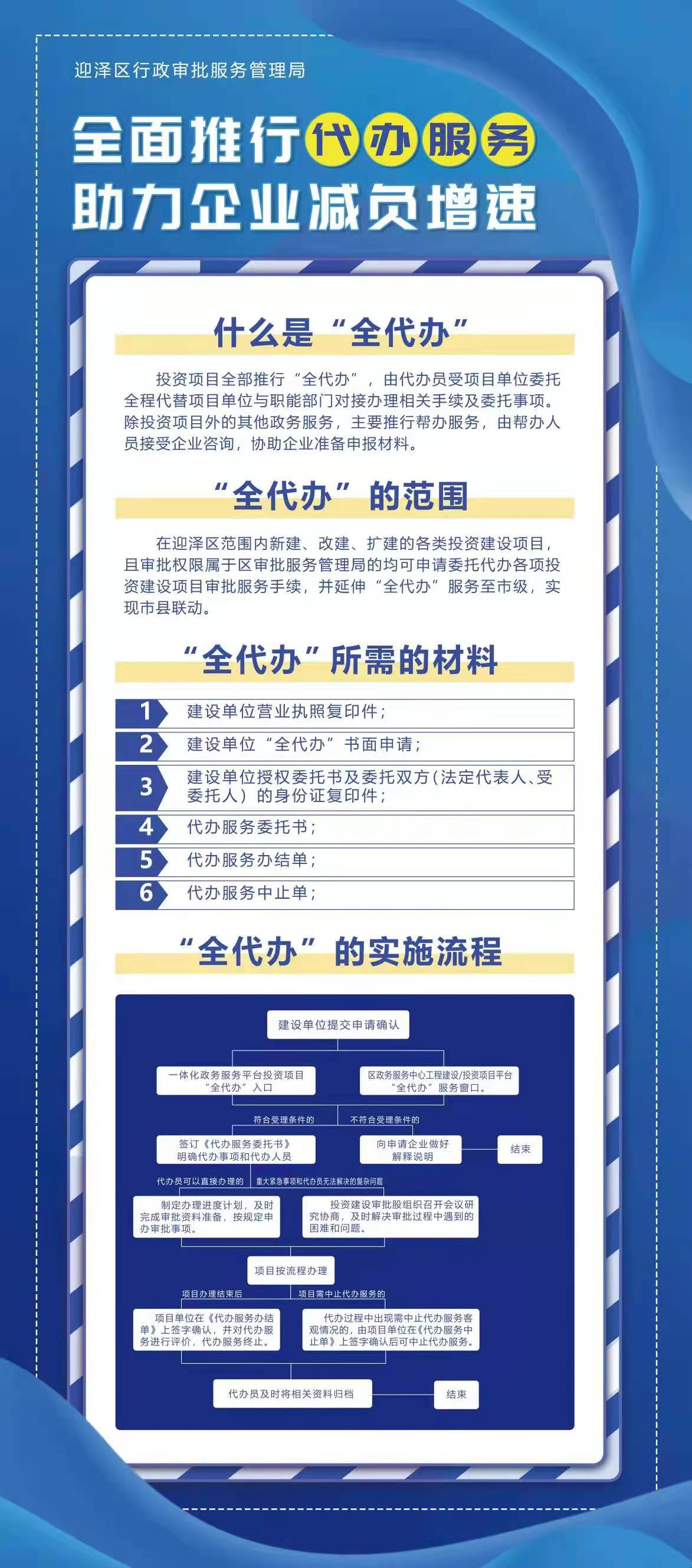 據介紹,針對項目審批手續(xù)多、時限長等問題,太原市迎澤區(qū)行政審批局梳理堵點痛點,實施流程再造,開展了投資項目建設“全代辦”服務,按照“合法高效、自愿委托、無償服務、全程跟蹤、協(xié)同聯(lián)動”的原則,為企業(yè)提供委托項目一部門辦、一窗入件、一人代跑、一律免費的“全代辦”服務。