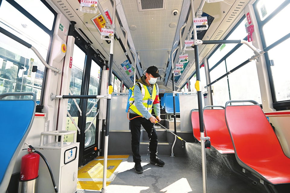 3月16日,太原公交三公司三車隊內(nèi),工作人員正在對公交車座位、拉手進行消殺,嚴格執(zhí)行疫情防控措施,確保市民乘車安全。(記者阮洋攝)
