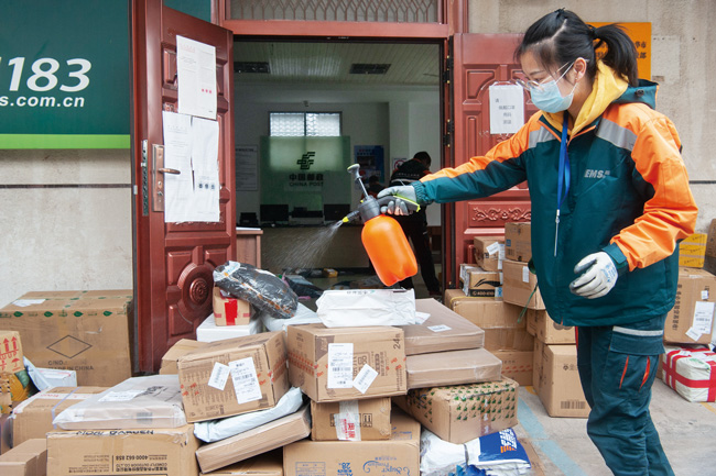3月20日,在金華一快遞公司人民東路特快專(zhuān)遞攬投部,員工給快件和派送車(chē)輛噴灑藥水進(jìn)行消殺。據(jù)了解,為做好新冠疫情防控工作,運(yùn)載快件的大型車(chē)輛到達(dá)后,卸貨前先要對(duì)車(chē)輛消殺,再給快件消殺;快遞員每次出車(chē)派送返回?cái)埻恫?,都要按要求給車(chē)輛消殺。工作場(chǎng)地每天早、中、晚消殺3次,記錄在工作臺(tái)賬上。(時(shí)寬兵)