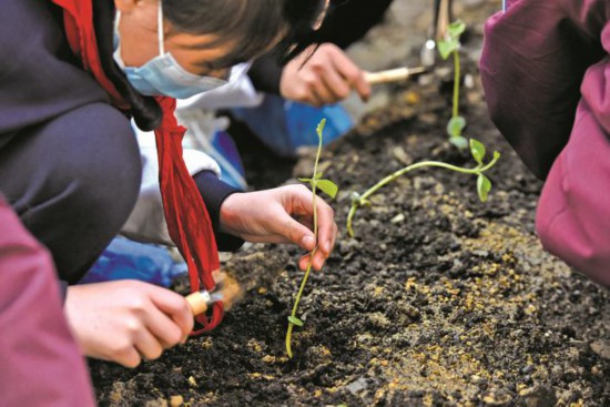 3月23日,嘉興一學(xué)校種植園,學(xué)生們在各班的“責(zé)任田”里忙著種植各種蔬菜和花卉。學(xué)校希望通過豐富多彩的種植活動,讓孩子們在親近植物、探究植物的過程中,提升綜合探究學(xué)習(xí)能力,同時也更好地推進學(xué)?!半p減”政策的落地。(馮玉坤)