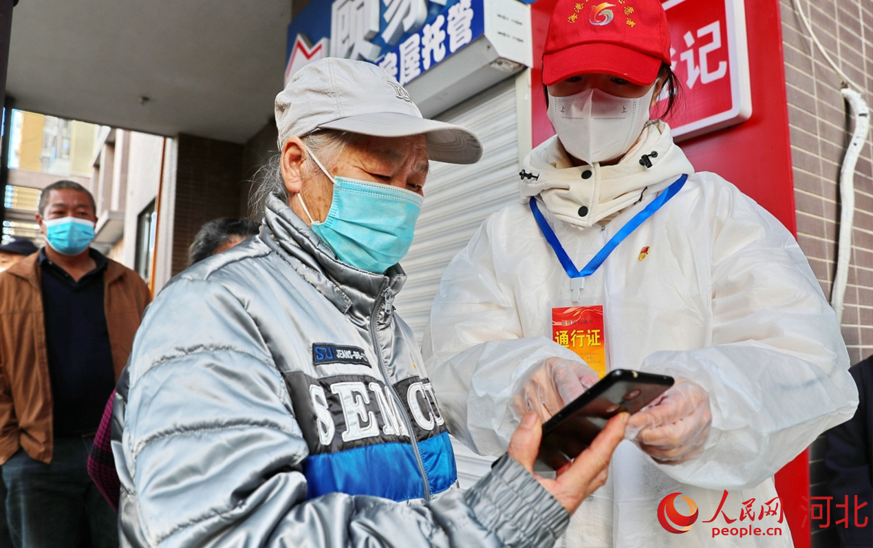 3月26日,在秦皇島市海港區(qū)白塔嶺街道森林逸城社區(qū)內(nèi),黨員志愿者指導居民使用電子健康卡。 曹建雄攝