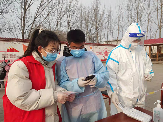 遷安市太平莊鎮(zhèn)蘇各莊營村大學生志愿者掃碼登記。 商立超攝