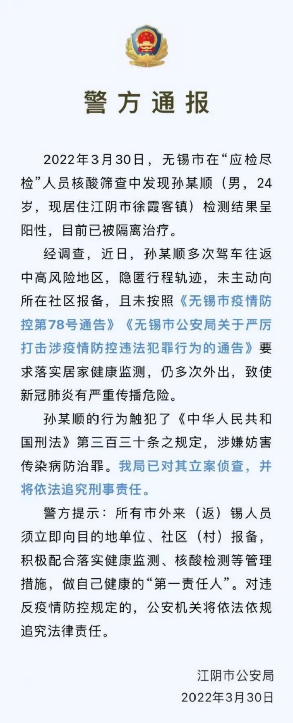 人民網(wǎng)南京3月31日電 (蕭瀟)據(jù)江蘇省無錫市江陰市公安局通報,一陽性男子因故意隱匿行程軌跡,違反抗疫規(guī)定,多次駕車往返中高風險地區(qū),致使新冠肺炎有嚴重傳播危險。公安機關已對其立案偵查,并將依法追究刑事責任。