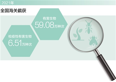 據(jù)統(tǒng)計(jì),2021年,全國(guó)海關(guān)截獲有害生物59.08萬(wàn)種次、檢疫性有害生物6.51萬(wàn)種次,首次檢出致死粒線蟲(chóng)、鈴蘭短體線蟲(chóng)、北美齒小蠹等危險(xiǎn)性有害生物,有效防止紅火蟻、高致病性禽流感等重大動(dòng)植物疫情疫病傳入,退回、銷(xiāo)毀不合格農(nóng)產(chǎn)品584批。