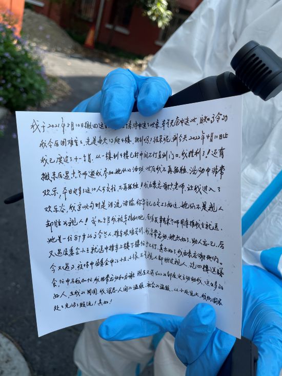 幾經(jīng)推辭,錢留在老人家手里,但她還執(zhí)拗地遞來兩封信,一封短的,本來包鈔票用的:這是給您們和廣大志愿者添些營養(yǎng)品用,望勿拒。還有封長信里提到,“疫情中,居委會(huì)的小王、小張,不是親人卻勝過親人,跑四樓送膳食,我非常感謝?!?/p>
