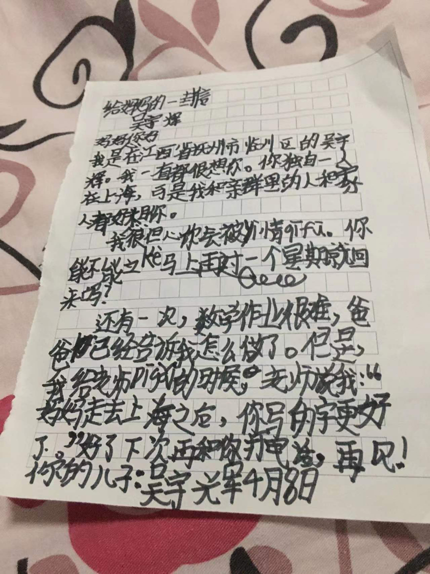 4月8日,張沖華的微信收到一條來自婆婆的消息,點(diǎn)開一看,原來是兒子的手寫信。“我一直都很想你……”剛看開頭,張沖華就抑制不住哭了起來。