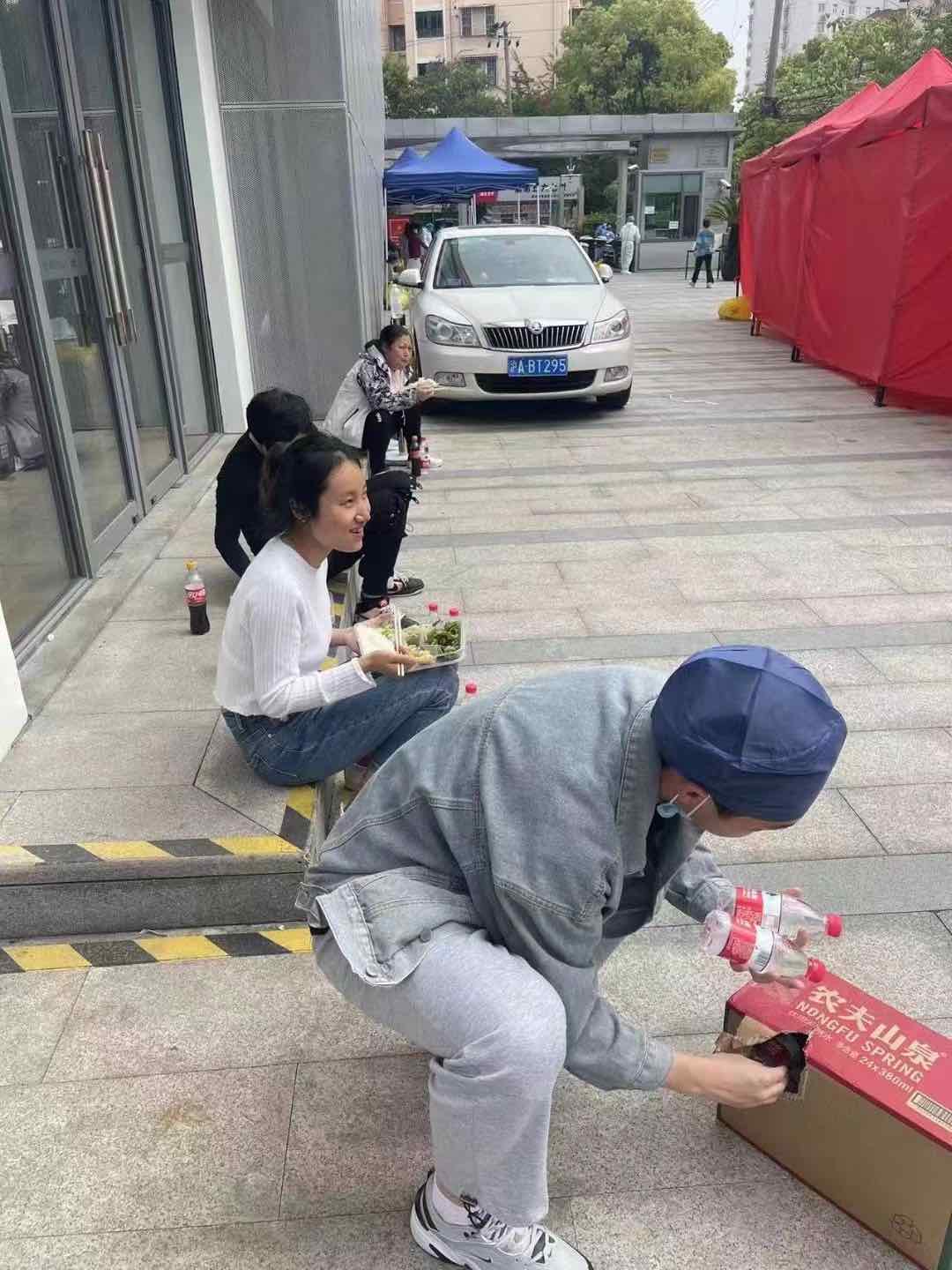 檢測間隙,隊員們席地而坐吃飯。