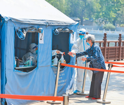 5月4日,北京西城區(qū)什剎海街道荷花市場(chǎng)核酸檢測(cè)現(xiàn)場(chǎng),工作人員引導(dǎo)老人通過(guò)綠色通道進(jìn)行核酸檢測(cè)。什剎海街道優(yōu)化點(diǎn)位設(shè)置,減少排隊(duì)時(shí)間。同時(shí)特別關(guān)注老人、兒童等群體,為他們開辟綠色通道,進(jìn)一步提高采樣工作效率。