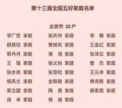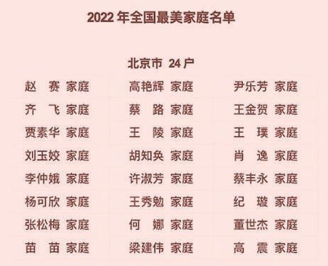 本報訊(記者 代麗麗)在5月15日國際家庭日來臨之際,全國婦聯(lián)表彰997戶全國五好家庭,200個全國家庭工作先進集體,198名全國家庭工作先進個人,揭曉997戶全國最美家庭。北京市有23戶家庭入選第十三屆全國五好家庭,24戶家庭入選2022年全國最美家庭。