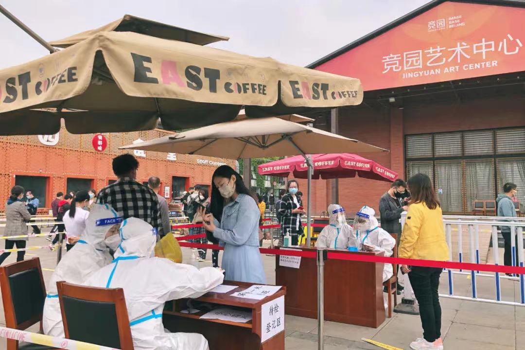 在通惠河畔文化創(chuàng)意產(chǎn)業(yè)園核酸檢測點,一枚枚紅色“黨員志愿服務(wù)”袖標(biāo)格外醒目。