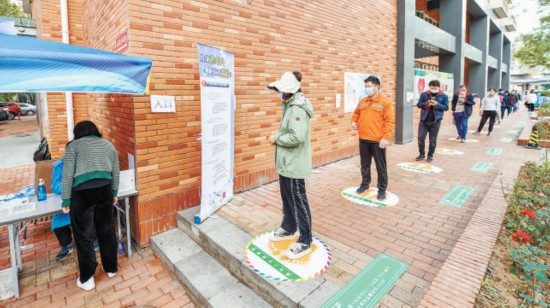 本報訊(記者 李瑤)昨天,東城區(qū)東四街道在轄區(qū)內(nèi)5個常態(tài)化核酸檢測點推出新式“兩米線”,通過充滿童趣的“呼啦圈”地貼,引導(dǎo)居民有序排隊,保持安全距離?!昂衾踩Α敝睆酱蠹s80厘米,中間黃色腳印圖案十分醒目,旁邊還印有疫情防控科普貼,居民站在圈內(nèi)有序排隊等待核酸檢測?!啊粌H富有童趣,使排隊等候不再那么乏味,還嚴格規(guī)定了排隊距離,保證大家的安全。”居民點贊說。本報記者 鄧偉攝