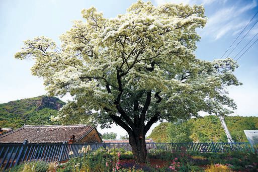 本報訊(記者 王可心)日前,密云區(qū)新城子鎮(zhèn)蘇家峪村一株古流蘇樹進入盛花期,作為北京市屈指可數的古流蘇樹,不僅因花枝觀賞性強受到民眾喜愛,更因其歷史價值而被廣泛關注。據了解,流蘇樹系北京市二級保護野生植物?!拔覀兇暹@株流蘇樹是一級古樹,據專家推斷,至今已有近600年歷史?!碧K家峪村黨支部書記王銀江介紹,該樹高約13米,主干到1.3米處分為兩主枝,向上延展成蘑菇形樹冠,平均冠幅約16米?;ㄆ陂_滿潔白的流蘇花,遠觀如覆霜蓋雪,流蘇細穗隨風搖曳,清香怡人。供圖/密云區(qū)委宣傳部