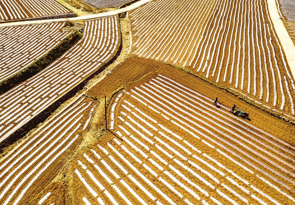 5月15日,晉中市左權(quán)縣下莊村鋪滿地膜的農(nóng)田在陽光照射下,構(gòu)成一幅錦繡太行的詩畫田園景致。近年來,左權(quán)縣積極落實糧食直補,地膜、農(nóng)機財政補貼的政策,極大地調(diào)動了農(nóng)民種糧的積極性,糧食連續(xù)獲得豐收。同時,通過農(nóng)旅融合,詩畫般的田園風(fēng)光吸引了不少游客,助推農(nóng)民增收。(邢蘭富)
