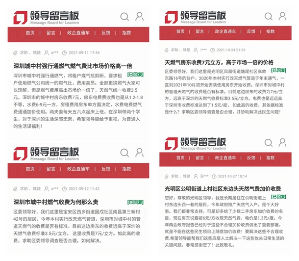 近年來(lái),隨著深圳全力推進(jìn)城中村管道燃?xì)飧脑?,“二房東”亂收燃?xì)赓M(fèi)的現(xiàn)象層出不窮。多位深圳網(wǎng)友曾在人民網(wǎng)“領(lǐng)導(dǎo)留言板”留言,反映房東收取的燃?xì)赓M(fèi)遠(yuǎn)高于《深圳市燃?xì)鈨r(jià)格制度標(biāo)準(zhǔn)》?!罢茝V天然氣入戶,是個(gè)大好事,我們都非常支持,可是卻給了少數(shù)二手房東加價(jià)收費(fèi)的名目?!币晃痪W(wǎng)友說(shuō)。