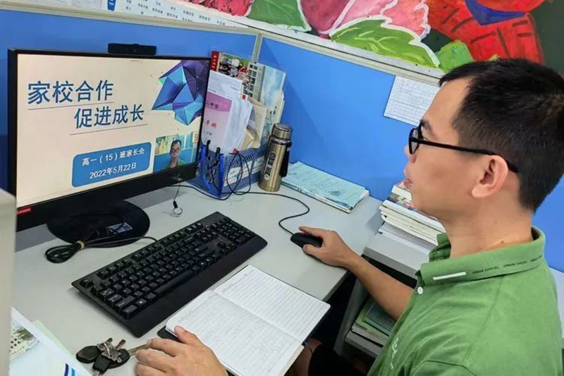 5月22號(hào)(捐獻(xiàn)造血干細(xì)胞的前一天),韓熠光在年級(jí)辦公室召開線上家長(zhǎng)會(huì)。??谑械诙袑W(xué)供圖