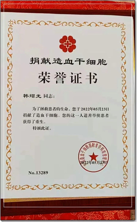 作為一名黨員,韓熠光一直熱心公益。2001年參與無償獻(xiàn)血,累計(jì)獻(xiàn)血量達(dá)1400毫升;2008年,他選擇成為一名中華骨髓庫志愿捐獻(xiàn)者;2022年,成為了海南省第144例捐獻(xiàn)造血干細(xì)胞的英雄……