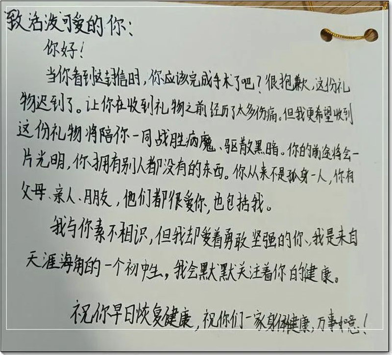愛是傳遞也是傳承。韓熠光的女兒在得知父親去做捐獻(xiàn)手術(shù)時(shí),手寫了一封祝福信寄給遠(yuǎn)方那位素不相識(shí)的“弟弟”,鼓勵(lì)他早日戰(zhàn)勝病魔,恢復(fù)健康。生命的種子,正伴隨著溫暖椰風(fēng),給6歲的小男孩送去生的希望……