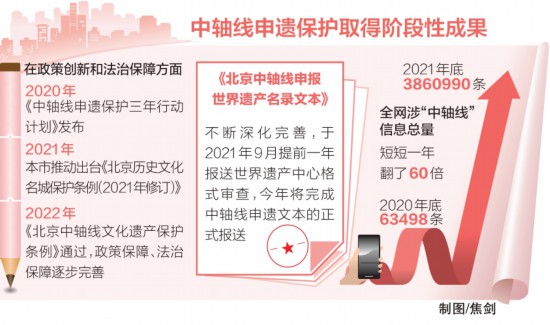 2017年,“積極推進(jìn)中軸線申遺工作”寫入《北京城市總體規(guī)劃(2016年—2035年)》。同年,北京市推進(jìn)全國(guó)文化中心建設(shè)領(lǐng)導(dǎo)小組批準(zhǔn)成立了中軸線申遺保護(hù)專項(xiàng)工作組,全面啟動(dòng)北京中軸線申遺保護(hù)工作……