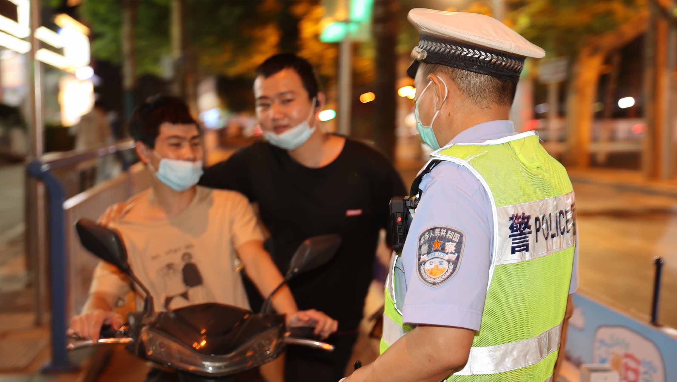 長(zhǎng)安交警大隊(duì)民警在中山路青園街口勸導(dǎo)電動(dòng)車騎乘人員佩戴安全頭盔。 王浩天攝