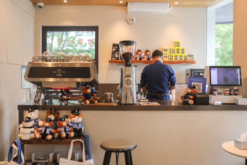 近日,在位于寧波市江北區(qū)的老外灘警務(wù)站內(nèi),一家面向市民開放的咖啡館開始營業(yè)。店面并不算大,但店內(nèi)各種制作咖啡的專業(yè)設(shè)備一應(yīng)俱全。吧臺上的民警手辦公仔、墻面上隨處可見的反詐宣傳海報(bào)、咖啡杯上的公安卡通貼紙……從門頭到店內(nèi)的各式裝潢無不彰顯著它的獨(dú)特氣質(zhì)。