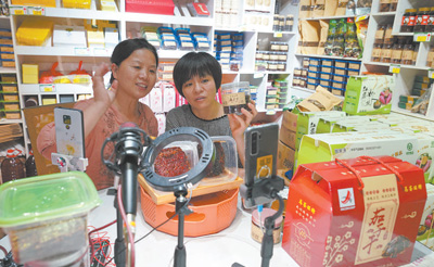江西鷹潭市余江區(qū)大力推廣網(wǎng)絡(luò)購(gòu)物、直播帶貨等消費(fèi)模式,本地茄子干、紅薯粉絲等綠色農(nóng)產(chǎn)品搭上網(wǎng)絡(luò)快車,走上百姓餐桌。圖為余江區(qū)益農(nóng)電商運(yùn)營(yíng)中心經(jīng)理于小葵(左)在店里直播帶貨。
