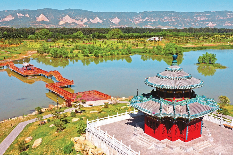 6月13日,在太原汾河景區(qū)四期工程望岳閣畔,一座木結(jié)構(gòu)景觀橋猶如江南水鄉(xiāng)景色,連廊臥波于汾河之上,為長(zhǎng)達(dá)十公里的汾河四期工程增添了浪漫畫(huà)卷。(記者劉通攝)