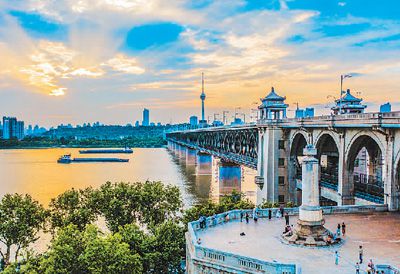 湖北武漢長(zhǎng)江大橋,在晚霞的映照下,與長(zhǎng)江構(gòu)成一幅美麗的畫卷。趙廣亮攝(人民圖片)