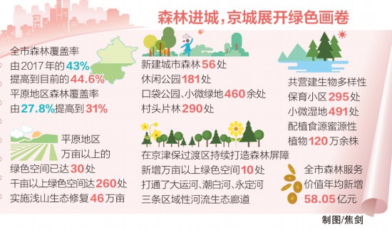 落實(shí)黨中央、國(guó)務(wù)院批復(fù)的城市總規(guī),2017年初,本市啟動(dòng)新一輪百萬(wàn)畝造林綠化工程。截至目前,五年造林綠化面積已達(dá)100.8萬(wàn)畝,本月底前,將圓滿超額完成新一輪百萬(wàn)畝造林任務(wù)。