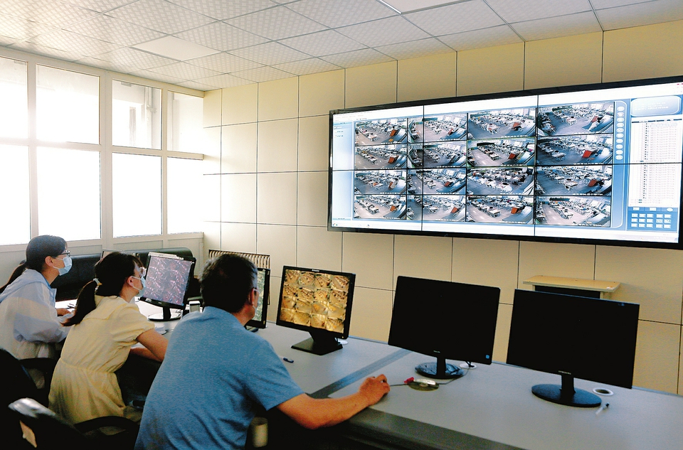6月20日,晉城市鳳臺中學(xué)考點,工作人員正通過監(jiān)控查看考場情況。