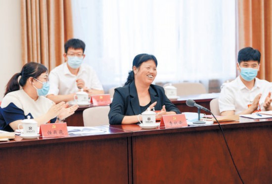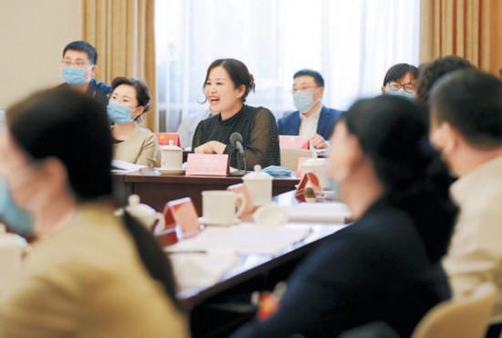 海淀代表團(tuán)會議中,張海燕代表結(jié)合黨代會報告,就中小科技企業(yè)如何留住科技人才提出建議。 本報記者 賈同軍攝