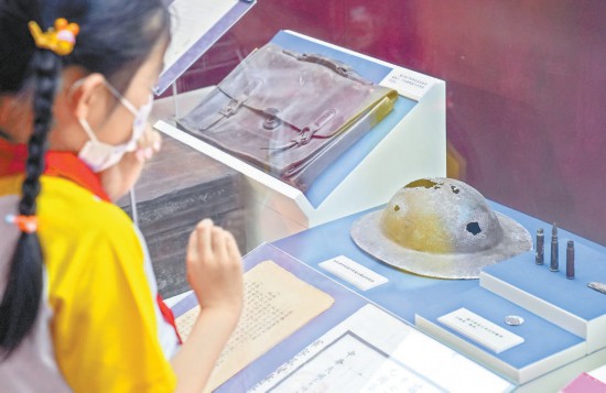 昨天,在中國人民抗日戰(zhàn)爭(zhēng)紀(jì)念館,《烽火印記——北京抗日戰(zhàn)爭(zhēng)主題片區(qū)特展》展廳內(nèi),參觀者在第29軍戰(zhàn)士的鋼盔前駐足。本報(bào)記者 武亦彬攝