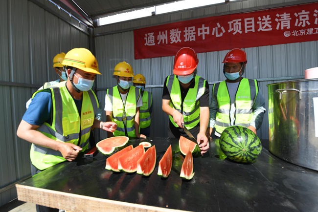 在通州數(shù)據(jù)中心項(xiàng)目頂板鋪設(shè)施工現(xiàn)場,高溫對(duì)奮戰(zhàn)在施工一線的員工來說無疑是一場巨大的“烤驗(yàn)”。“雖然現(xiàn)場的溫度達(dá)到了38℃,但是項(xiàng)目部合理調(diào)配時(shí)間,對(duì)現(xiàn)場的防暑降溫工作做了全面部署,施工現(xiàn)場配備了西瓜、綠豆湯、藿香正氣水和清涼油等防暑物資,在場邊設(shè)置了遮陽涼棚,并且讓施工人員避開上10點(diǎn)到下午3點(diǎn)的高溫期錯(cuò)時(shí)上崗,保證現(xiàn)場安全生產(chǎn)的同時(shí)也盡量不耽誤項(xiàng)目進(jìn)度?!表?xiàng)目部負(fù)責(zé)人胡永忠說。