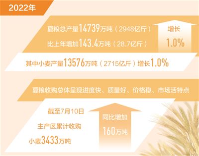 國家統計局7月14日發(fā)布數據顯示:2022年全國夏糧總產量14739萬噸(2948億斤),比上年增加143.4萬噸(28.7億斤),增長1.0%。其中,小麥產量13576萬噸(2715億斤),增長1.0%。