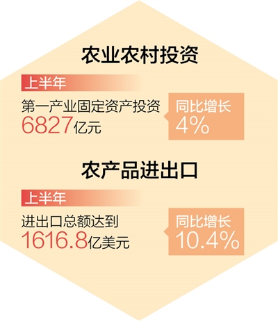 農(nóng)業(yè)農(nóng)村投資穩(wěn)步增長,農(nóng)村消費(fèi)市場逐步恢復(fù)。農(nóng)業(yè)農(nóng)村投資渠道拓寬。落細(xì)落實(shí)扎實(shí)穩(wěn)住經(jīng)濟(jì)一攬子政策措施,全力推動(dòng)重大政策落地實(shí)施和重大工程項(xiàng)目開工建設(shè)。上半年,第一產(chǎn)業(yè)固定資產(chǎn)投資6827億元,同比增長4%。鄉(xiāng)村消費(fèi)持續(xù)恢復(fù)。鄉(xiāng)村消費(fèi)品零售額2.77萬億元,與去年基本持平,恢復(fù)到2019年的98%。農(nóng)產(chǎn)品進(jìn)出口保持增長勢頭,進(jìn)出口總額達(dá)到1616.8億美元,同比增長10.4%。