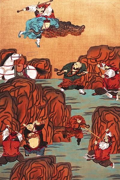 《西游記·車遲國(guó)》是周京新“西游”系列中的一幅,描繪了唐僧師徒取經(jīng)路上路過(guò)車遲國(guó),與虎力、鹿力、羊力三個(gè)妖怪斗法的場(chǎng)景。在他的創(chuàng)作中,中國(guó)畫(huà)的工筆與寫意并非涇渭分明,體現(xiàn)了“以工養(yǎng)寫”的思考,人物造型緊湊結(jié)實(shí)而又不乏詼諧的生趣,山石樹(shù)木屋宇乃至黑霧祥云均有裝飾意趣。