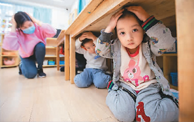 圖四:江蘇省南京市雨花臺區(qū)龍福幼兒園小朋友們學(xué)習(xí)防災(zāi)減災(zāi)自救技能。蘇陽攝(人民視覺)