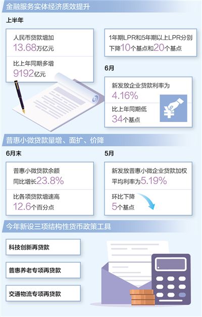 數(shù)據(jù)顯示,上半年,我國(guó)社會(huì)融資規(guī)模增量為21萬億元,同比多增3.2萬億元,人民幣貸款增加13.68萬億元,比上年同期多增9192億元。與此同時(shí),央行持續(xù)釋放貸款市場(chǎng)報(bào)價(jià)利率(LPR)改革潛力,1年期LPR和5年期以上LPR分別下降10個(gè)基點(diǎn)和20個(gè)基點(diǎn),6月份新發(fā)放企業(yè)貸款利率為4.16%,比上年同期低34個(gè)基點(diǎn),企業(yè)綜合融資成本穩(wěn)中有降,金融服務(wù)實(shí)體經(jīng)濟(jì)的質(zhì)量和效率明顯提升。