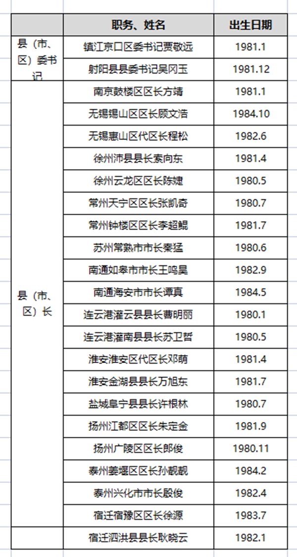 除了年輕化、高學(xué)歷,他們中不少人還有地級市團(tuán)委工作經(jīng)驗。如射陽縣委書記吳岡玉曾任共青團(tuán)鹽城市委書記,海安市長譚真曾任共青團(tuán)南通市委副書記,泰州姜堰區(qū)長孫靚靚曾任共青團(tuán)鹽城市亭湖區(qū)委副書記、共青團(tuán)泰州市委書記,賈敬遠(yuǎn)也曾任共青團(tuán)鎮(zhèn)江市委書記。