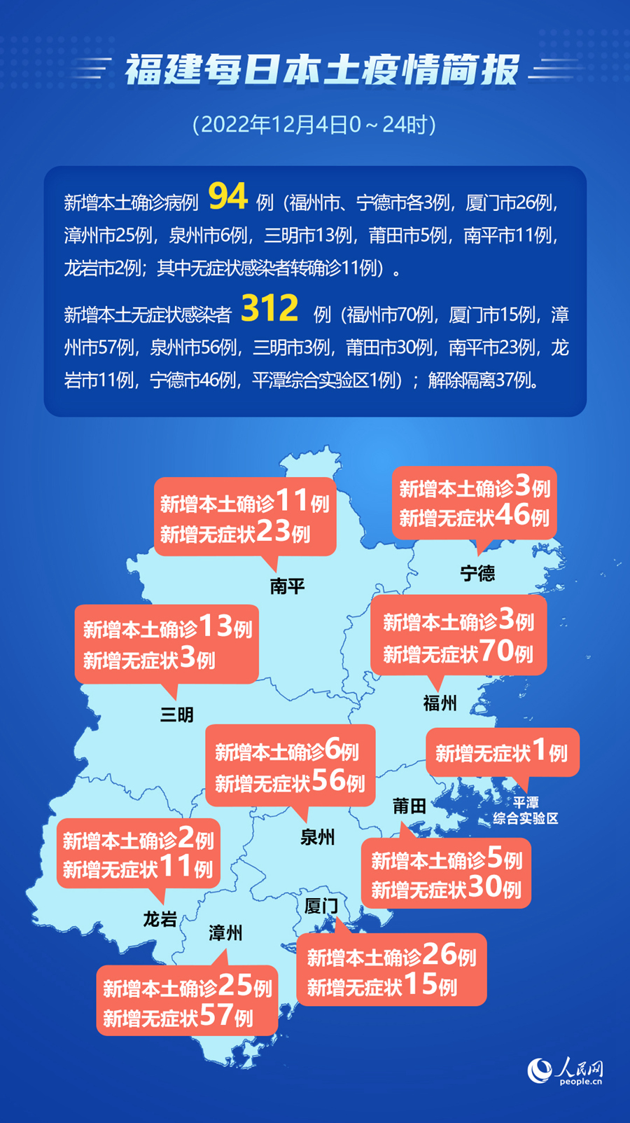 人民網福州12月5日電 (易雪妍、陳永整)據(jù)福建省衛(wèi)健委網站消息,12月4日0~24時,福建省報告新增本土確診病例94例(福州市、寧德市各3例,廈門市26例,漳州市25例,泉州市6例,三明市13例,莆田市5例,南平市11例,龍巖市2例;其中無癥狀感染者轉確診11例)。當日報告新增本土無癥狀感染者312例(福州市70例,廈門市15例,漳州市57例,泉州市56例,三明市3例,莆田市30例,南平市23例,龍巖市11例,寧德市46例,平潭綜合實驗區(qū)1例);解除隔離37例。