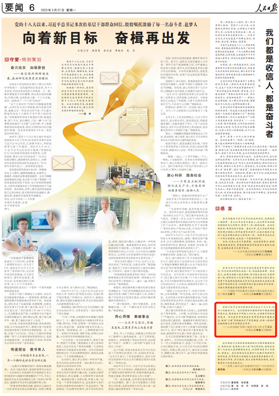 黨的十八大以來,習(xí)近平總書記多次給各行各業(yè)干部群眾回信,勉勵(lì)大家心系祖國、志存高遠(yuǎn)、腳踏實(shí)地,在奮斗中創(chuàng)造精彩人生,為全面建設(shè)社會(huì)主義現(xiàn)代化國家、實(shí)現(xiàn)中華民族偉大復(fù)興的中國夢積極貢獻(xiàn)智慧和力量。