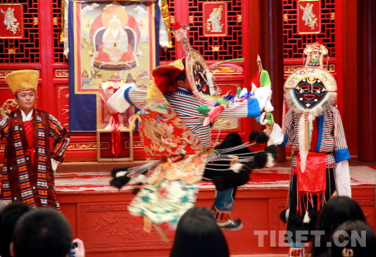 圖為拉薩市城關(guān)區(qū)娘熱民間藝術(shù)團(tuán)演員表演國家級(jí)非物質(zhì)文化遺產(chǎn)“堆諧”攝影:劉莉