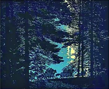 面對彼時套色木刻創(chuàng)作存在的這一問題,晁楣通過不懈研究與探索找到了解決的方法。他放棄了過去以黑線勾勒輪廓再以彩色填充的方式,大膽采用色塊拼接的新方法,將黑色與彩色并置在畫面中,使黑色輪廓線融入暗部,統(tǒng)一為一個個整體色塊。晁楣強調(diào),套色木刻中不能沒有黑色,因為它在畫面中發(fā)揮著重要的作用。這種“剪影式”的構(gòu)圖大量削減了輪廓線在畫面中的應(yīng)用,帶來強烈的色彩對比以及極具視覺張力的疏密關(guān)系,使得畫面結(jié)構(gòu)主次分明,保持了作品的整體感。試看晁楣的套色木刻作品《北陲屏障》,逆光的環(huán)境中,頂天立地、枝繁葉茂的松樹剪影占據(jù)了畫面的大部分空間,在遠處光源的照耀下,一隊騎乘戰(zhàn)馬的巡邏兵疾馳而過,形成了動靜交織的畫面節(jié)奏。作品用為數(shù)不多的色彩營造光感,套色簡潔自然,茂密枝干交織形成的無數(shù)小色塊,展現(xiàn)出藝術(shù)家精湛的運刀技藝。