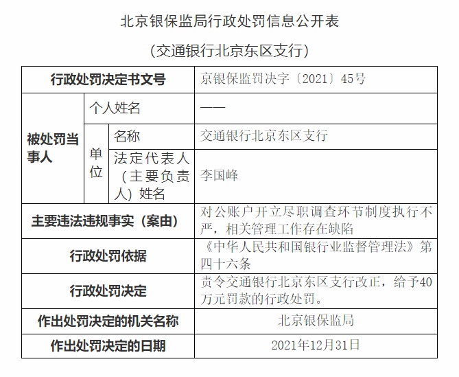 對公賬戶開立盡職調查環(huán)節(jié)制度執(zhí)行不嚴 交通銀行北京東區(qū)支行被罰40萬元