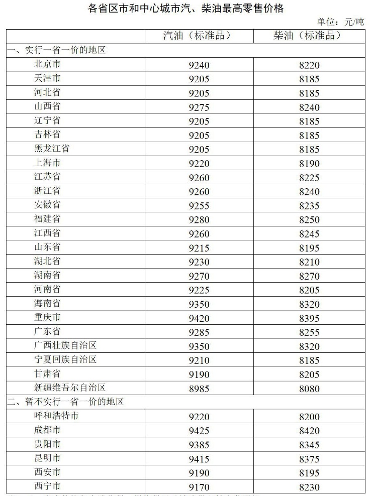 附:各省區(qū)市和中心城市汽、柴油最高零售價格