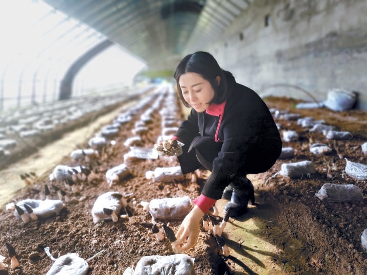 一頭利落的短發(fā),筆挺的身姿,明亮的笑容,39歲的董偉給人的第一印象有點(diǎn)颯。跟隨她來(lái)到位于懷柔區(qū)廟城鎮(zhèn)王史山村的溫室大棚,只見一個(gè)個(gè)小傘般的蘑菇頂蓋從土中鉆出來(lái),看上去皺皺巴巴,筆直的菌柄呈象牙白色,村民們手持特制的小彎刀,嫻熟地將蘑菇從根部割下,不一會(huì)兒就裝滿了一筐?!斑@是羊肚菌,一種珍稀食用菌,聞起來(lái)有一股淡淡的香味?!闭f起蘑菇種植,董偉如數(shù)家珍,“羊肚菌是低溫菇,溫度一上來(lái)就不行了,收獲已經(jīng)接近尾聲?!?/p>
