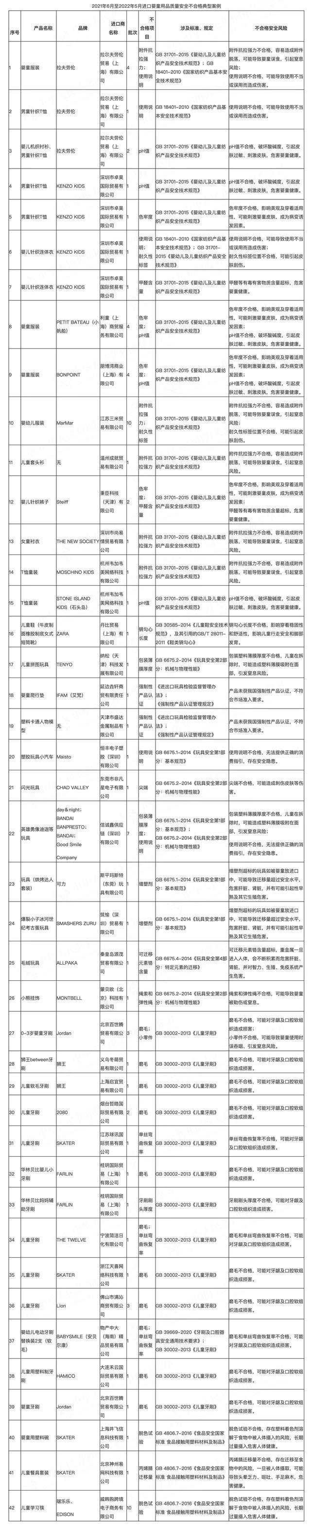 央廣網(wǎng)北京6月1日消息 據(jù)海關(guān)總署網(wǎng)站消息,6月1日,海關(guān)總署通報(bào)2021年6月至2022年5月間檢出的部分進(jìn)口嬰童用品質(zhì)量安全不合格典型案例,包括服裝、童鞋、玩具、牙刷、食品接觸產(chǎn)品等5類(lèi)82批次進(jìn)口嬰童用品,涉及拉夫勞倫、KENZO KIDS、ZARA和獅王等多個(gè)品牌產(chǎn)品。