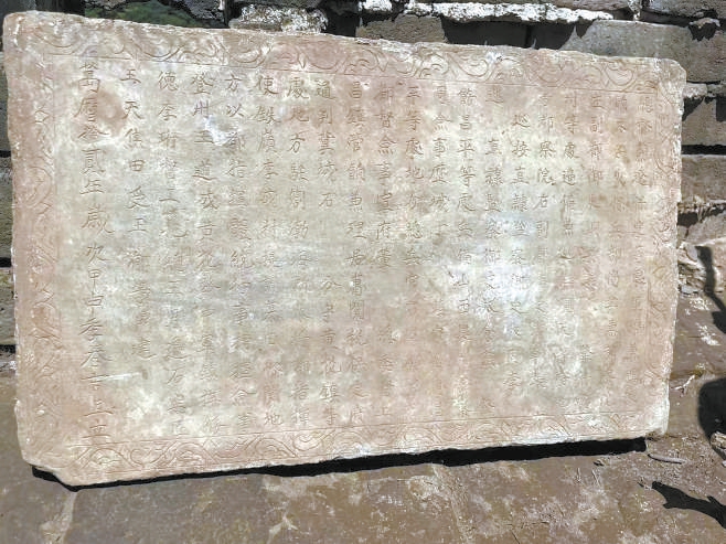 “發(fā)現(xiàn)一塊石碑,出土時碑文一面向下,推測這塊石碑原來鑲嵌在北側垛口墻內側,墻體傾斜倒塌后,石碑脫落?!表椖靠脊咆撠熑恕⒈本┛脊叛芯吭焊毖芯繂T尚珩介紹。石碑為青石材質,保存完整,邊框刻著纏枝卷草紋。因為脫落時碑文面朝下,因此碑文保存完好,字體為繁體字,字跡娟秀,清晰可辨。